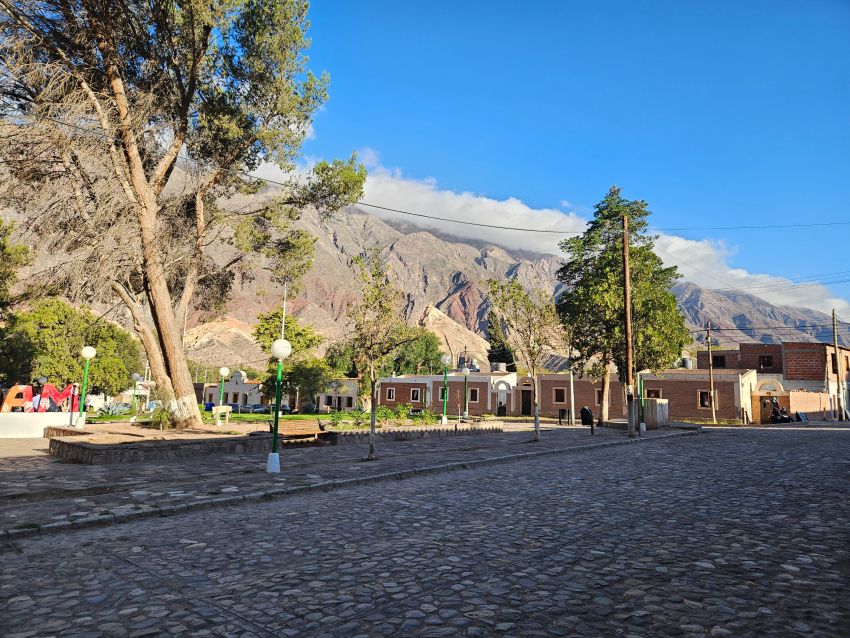 Tilcara es una ciudad un poco más grande, hay más locales turísticos y se ve más movimiento en las calles céntricas. También se ven las montañas al final de alguna calle o por encima de las casitas, todas bajas.