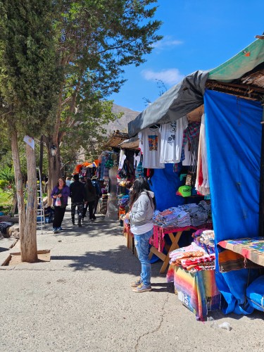 En la plaza se pueden encontrar puestos con productos locales y artesanías, aunque al estar cubiertos con plásticos o nylon le sacan un poco el encanto. Y a pocos metros de la plaza se puede visitar el mercado, aquí podrás encontrar cualquier cosa y es donde se abastecen también los habitantes de la ciudad.